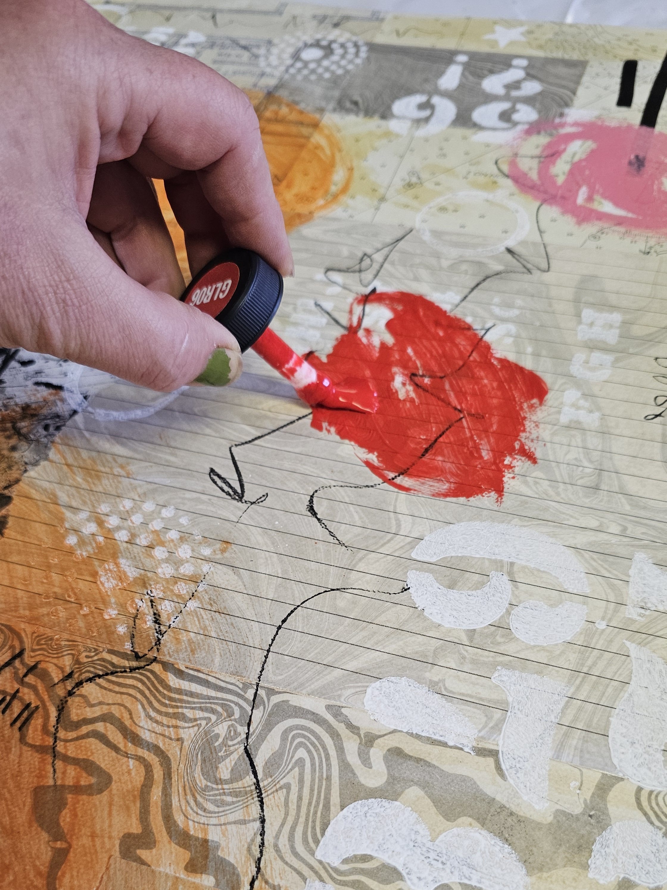 The class walks you through painting and collaging a canvas, cutting it up into book-cover sized pieces then making three hand-sewn journals out of them. I love this process! I painted the canvas more than a month ago then had to set it aside as I got too busy.