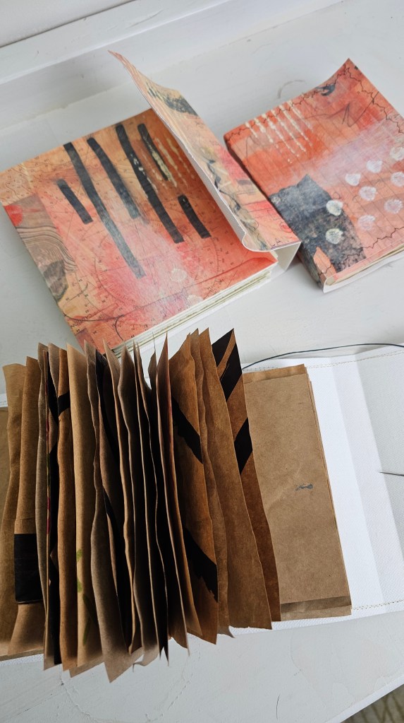 For the pages I used recycled brown papers in various weights, some painted, some plain. I’m pretty pleased! You can see the others in the background, waiting to be sewn together. So happy to add another pretty book to my shelves!
