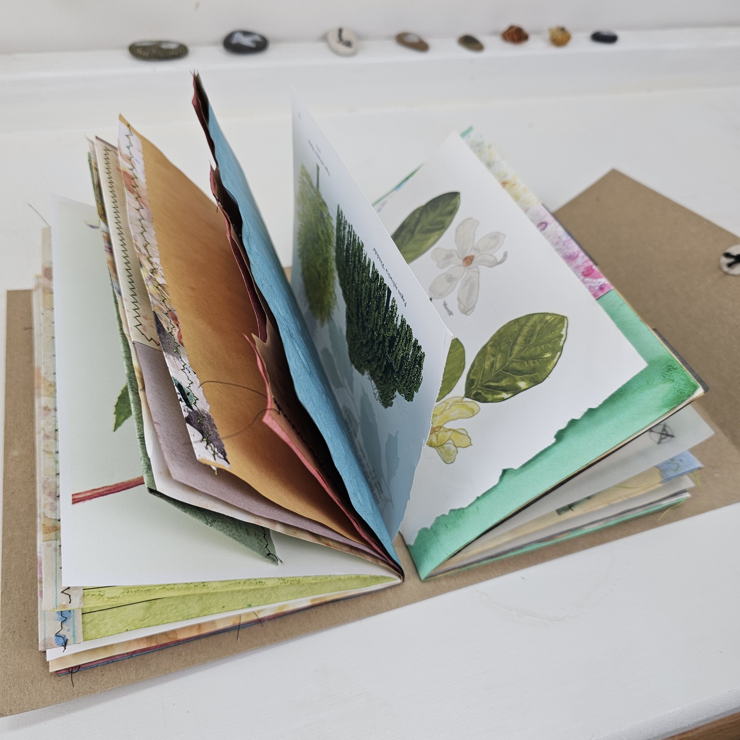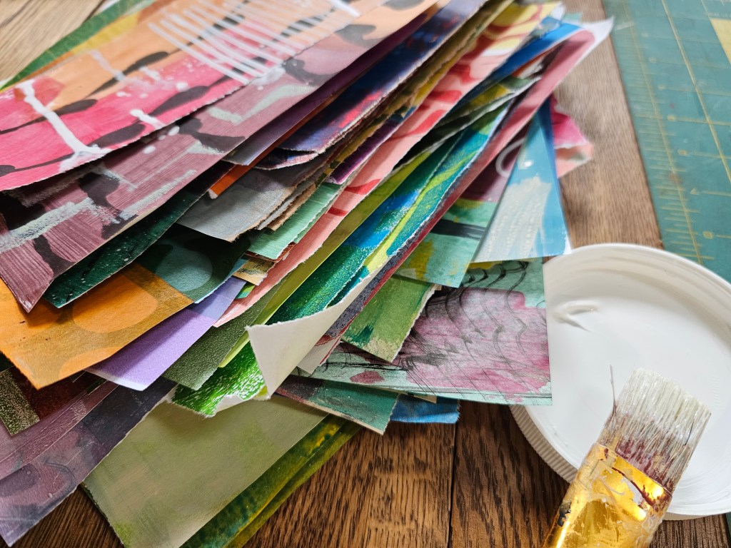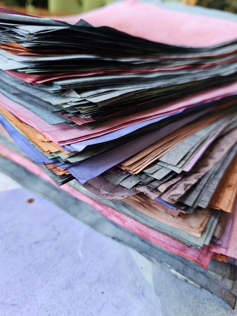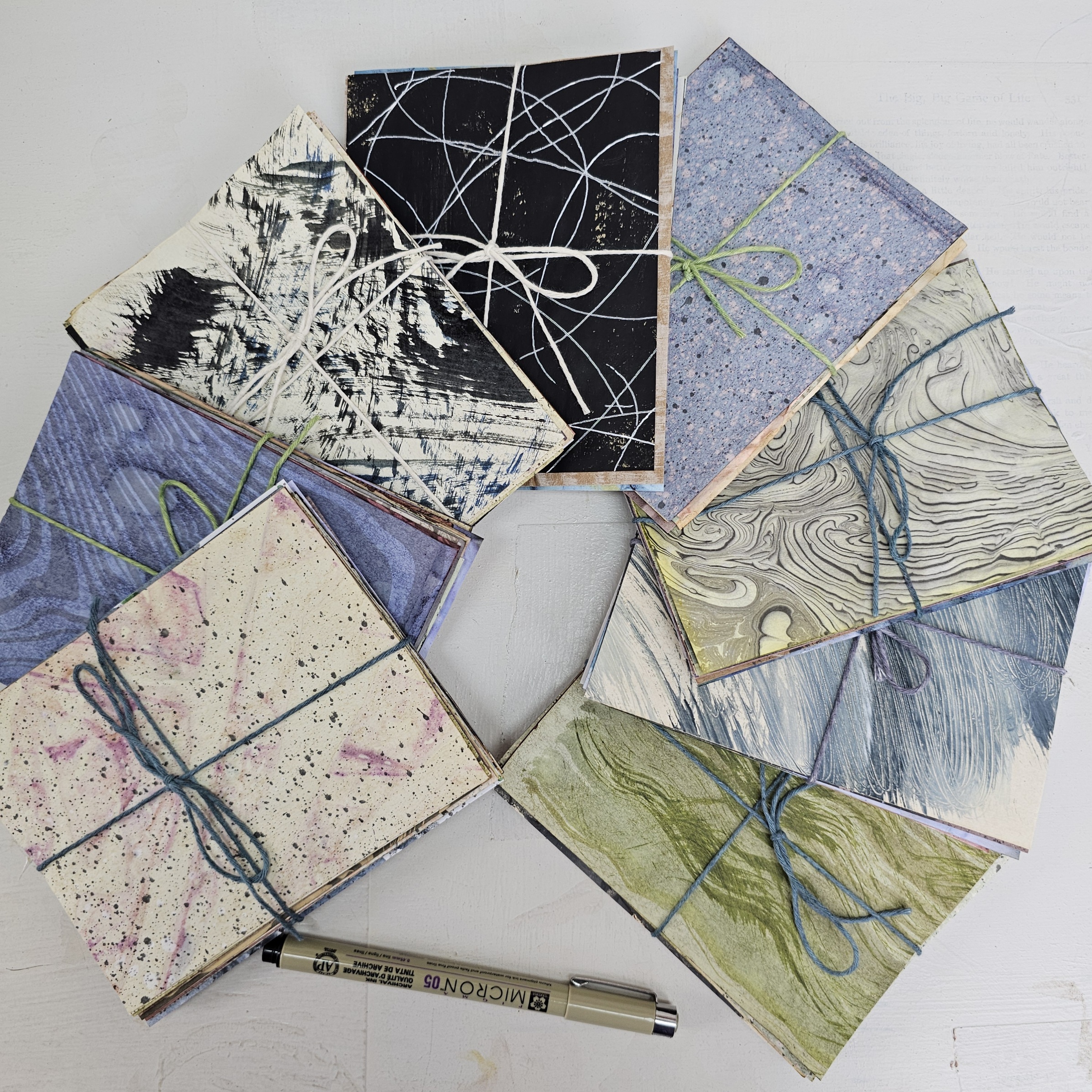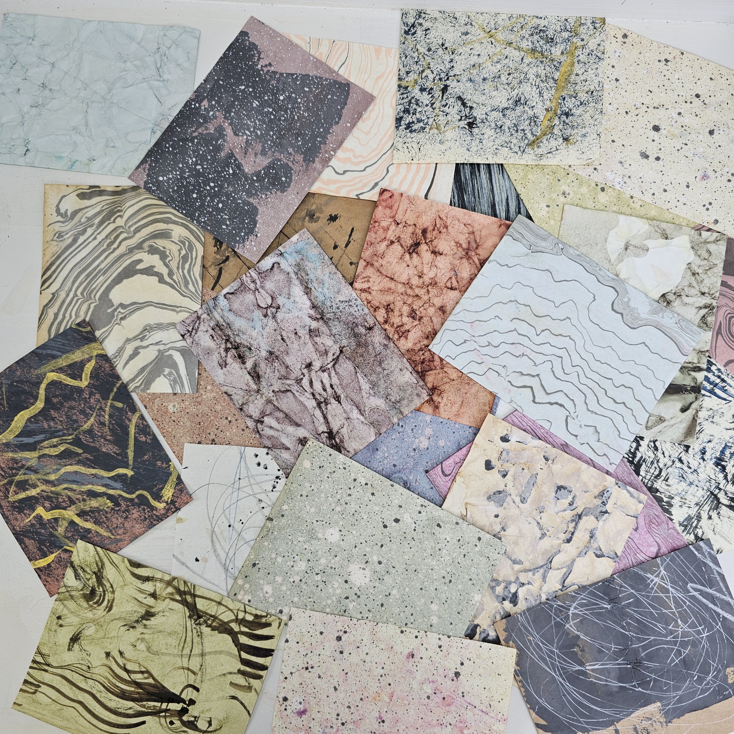 We use many types of mediums to transform ordinary paper into unique, one-of-a-kind art papers for use in bookmaking, collage, card making, junk journals and more.