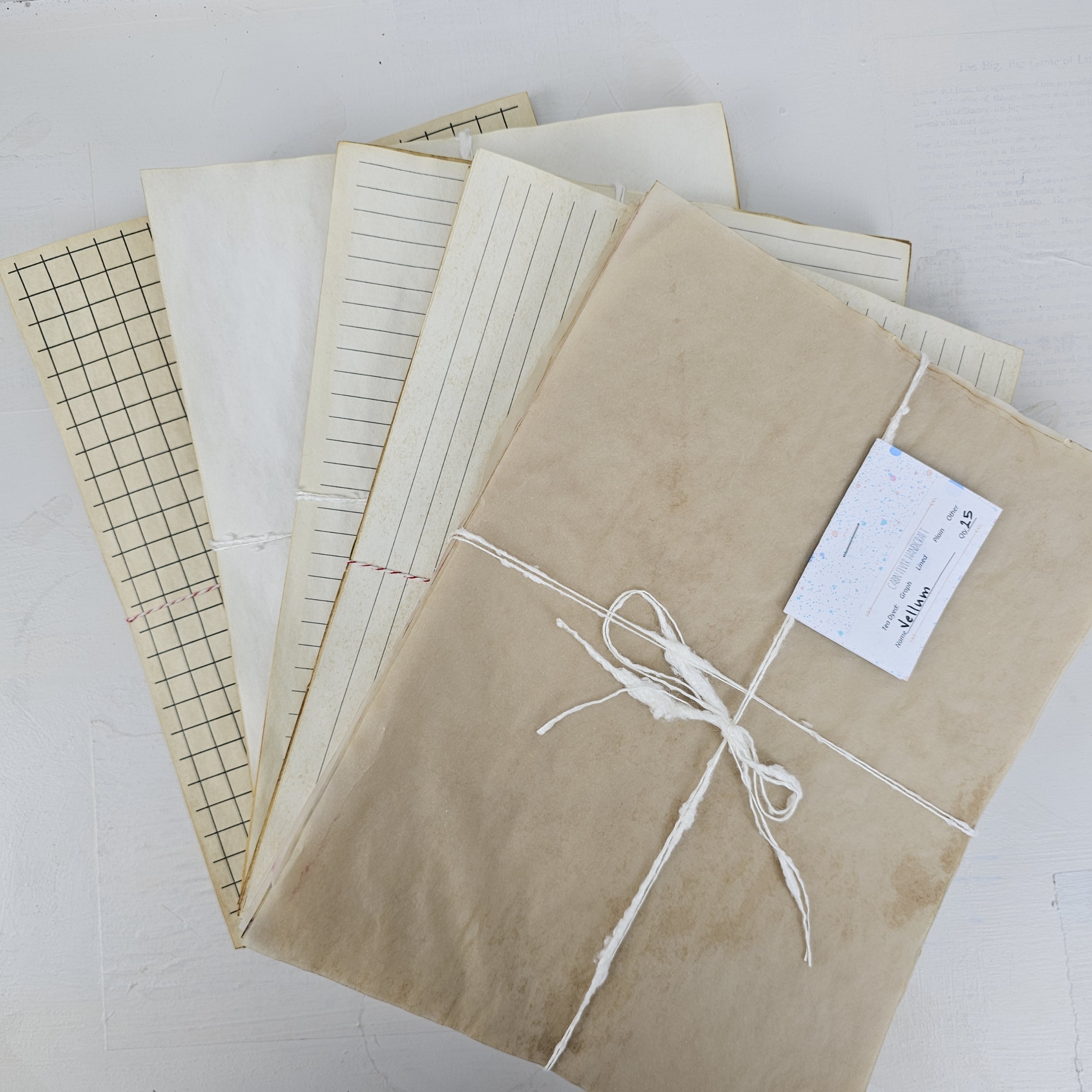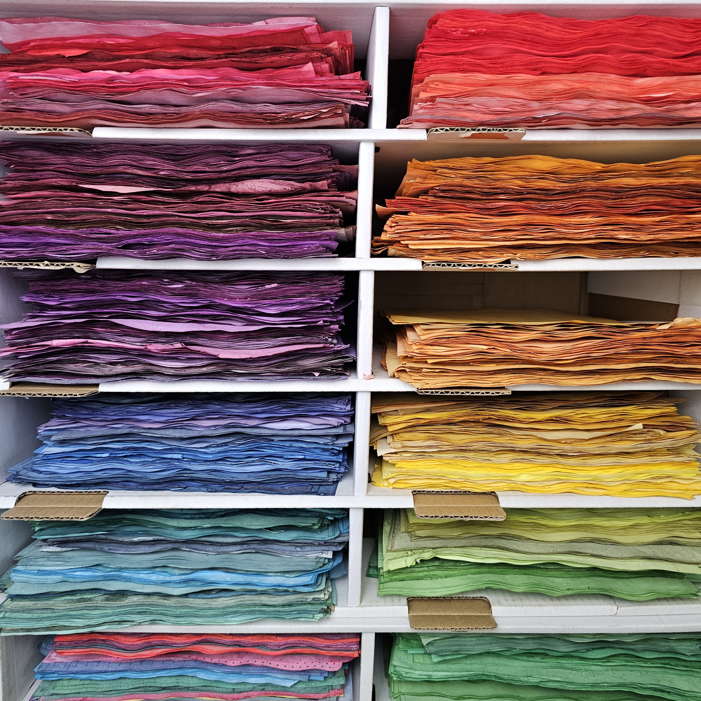 Papers we use include copy paper, recycled brown paper, tissue, vellum, nautical charts, blueprints, and others. We then transform it by dying, bleaching, splattering, painting, stenciling, wrinkling, tearing, ironing, or baking. We celebrate the drips, little tears, undissolved pigments, and textures left behind by different drying techniques and often feature them in our projects. Whatever papercraft you pursue, we probably have just the right thing!